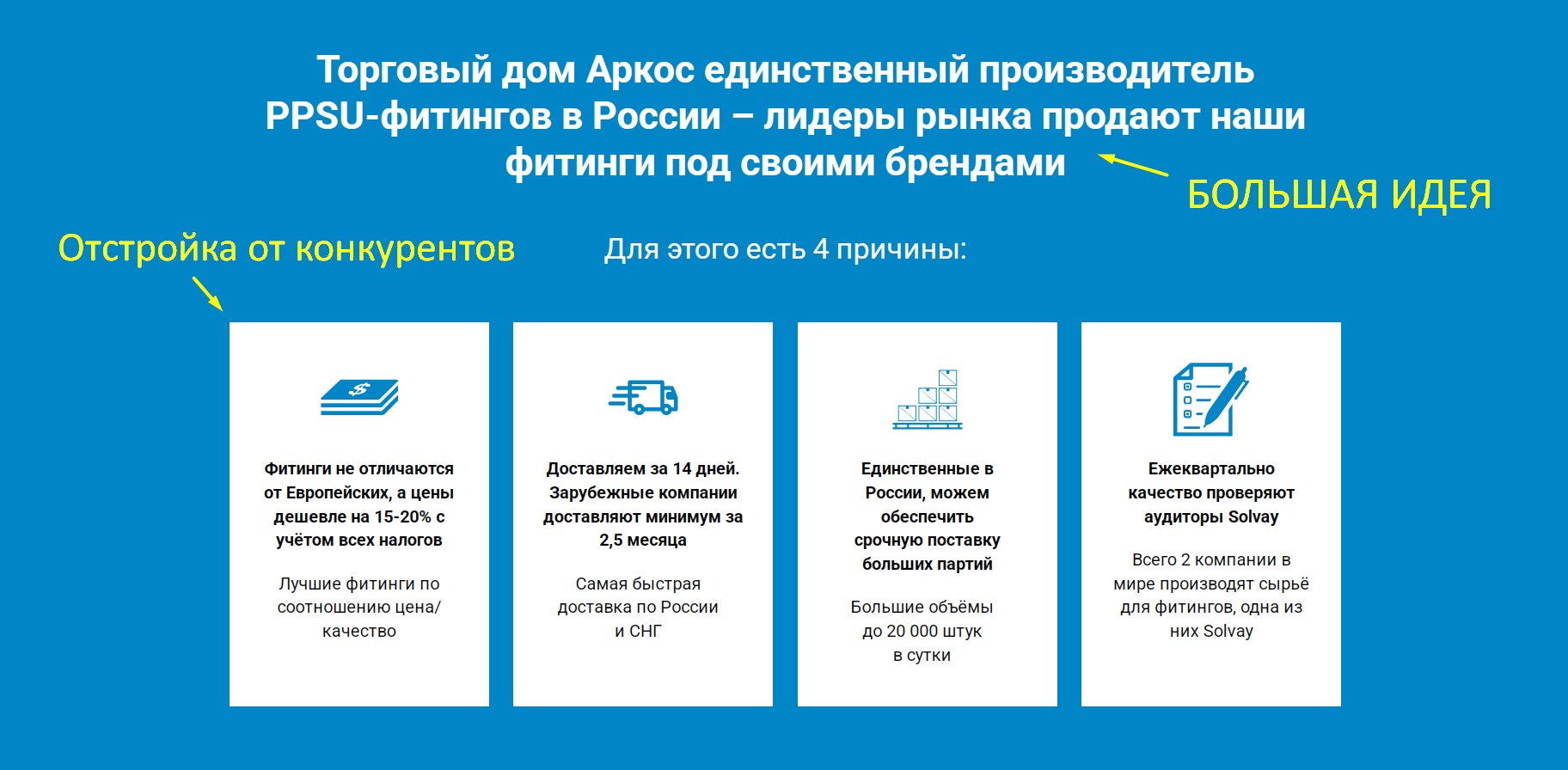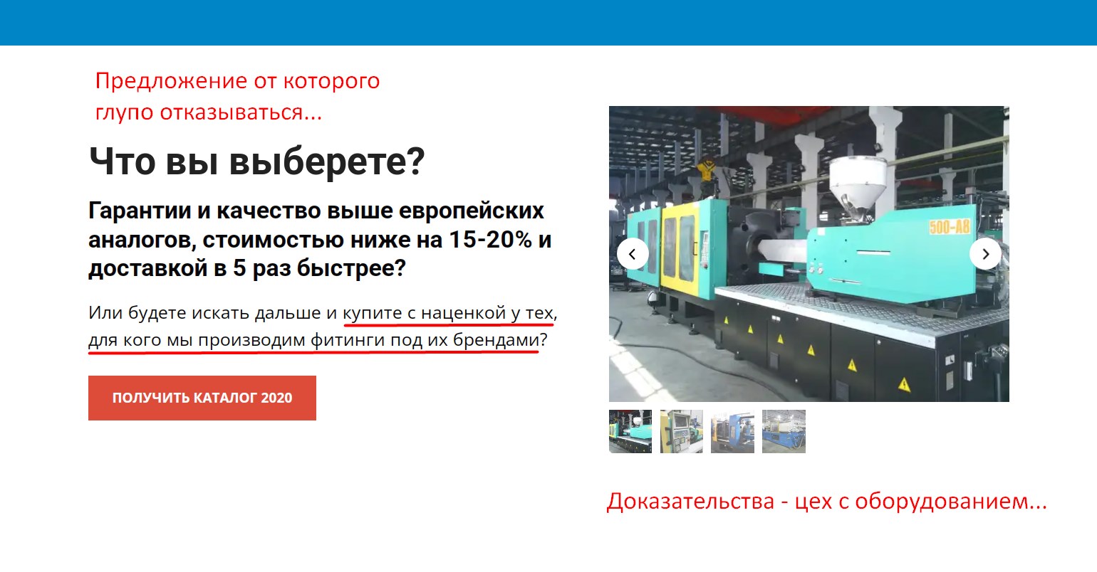 Начиная с первого экрана, мы делаем акцент на том, что наши фитинги продают под своими брендами лидеры рынка.